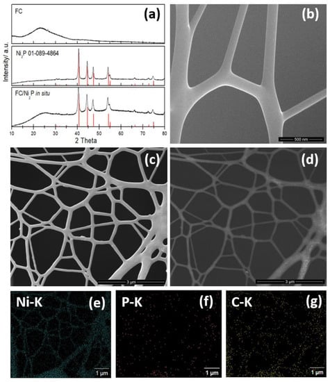 (a) X-ray diffraction of carbon fiber (FC), Ni2P and in situ FC/Ni2P composite. SEM images of (b) carbon fiber (FC) and (c) in situ FC/Ni2P composite. (d) Backscattering electron micrographs (BSE) of the in situ FC/Ni2P composite. Energy dispersive X-ray spectroscopy (EDX) of (e) nickel, (f) phosphorus and (g) carbon phosphorus.