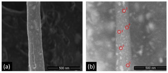 (a) SEM image of in situ FC/Ni2P composite, and (b) BSE image of in situ FC/Ni2P composite. An EDX analysis was performed per point from the points indicated in BSE image.
