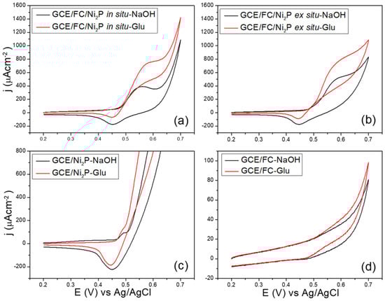 The electrocatalytic behavior of modified glassy carbon electrodes was analyzed using cyclic voltammetry in the presence and absence of 1.00 mM glucose, using a potential range of 0.200 to 0.700 V in 0.100 M NaOH solution. The voltammograms obtained using the GCE/FC/Ni2P in situ, GCE/FC/Ni2P ex situ and GCE/Ni2P modified electrodes (Figure 3a–c, respectively) show that in the absence of glucose (black lines), a redox process occurs close to 0.450–0.500 V. According to the literature, we assign this process to the nickel Ni2+/Ni3+ redox process [,]. On the other hand, when the GCE/FC electrode is used no current response is observed in the potential range analyzed (Figure 3d). Moreover, when the pH was changed to 10 and 11 no signals were observed using either composite (Figure S6 for GCE/FC/Ni2P in situ electrode). In an alkaline medium the formation of the NiOx/Ni(OH)x species on the Ni2P surface has been demonstrated, so it is reasonable to conclude that the observed peaks are derived from the surface faradaic reaction between the NiOx/Ni(OH)x species and NiOOH [], according to: