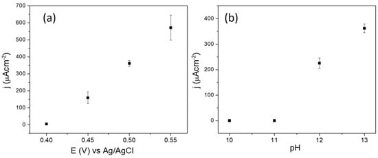 The working pH is an important factor in the glucose oxidation reaction, so the electrochemical response of GCE/FC/Ni2P in situ after the addition of 300 µM glucose was investigated over a range of pH values from 10 to 13. From Figure 4b, it is observed that the anodic current density increases from pH 12 to 13 and is practically null at lower pH values. To corroborate that no electrochemical signal is obtained by amperometry at low pH values, cyclic voltammetry was performed over a wide range of potentials (Figure S3). The results show no signals related to glucose oxidation, proving the necessity of a highly basic environment for the occurrence of redox processes. On the other hand, the oxygen evolution reaction has been observed at higher pH values (pH ≈ 14) when metal phosphide catalysts are used []. Considering this, pH 13 was chosen as the optimal value for this study.