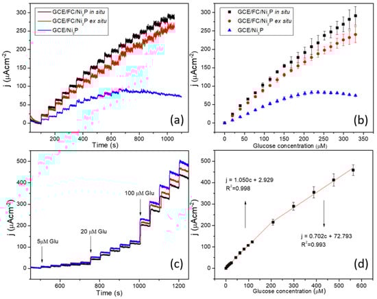 (a) Amperometric response of modified electrodes to successive addition of glucose in 0.100 M NaOH solution with a potential of 0.500 V vs. Ag/AgCl electrode and (b) current response as a function of glucose concentration, corresponding to three measurements. (c) Amperometric response of the GCE/FC/Ni2P in situ sensor to successive addition of glucose in 0.100 M NaOH solution with a potential of 0.500 V vs. Ag/AgCl electrode and (d) response in the current density as a function of glucose concentration, corresponding to three measurements.