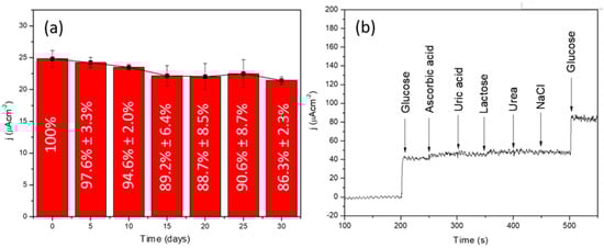 The measurement of glucose through reliable methods is a very relevant issue due to its increased demand for medical diagnoses of diabetes mellitus (DM). Thus, its early detection will improve the quality of life in patients, considering that DM leads to many deaths worldwide []. Many sensors have been developed to monitor glucose levels in patients with DM. Currently, commercial electrochemical glucose sensors are invasive, due to the need for a blood sample, and are based on enzymatic proteins as recognition elements, with glucose oxidase being the most commonly used. Despite their high sensitivity and selectivity, these sensors have a high cost and are unstable with changes in temperature, pH, and humidity due to the enzymes used, making their practical applications difficult [,]. To avoid these drawbacks, it is of great importance to develop sensitive and selective non-enzymatic sensors for glucose detection in less painful or non-invasive matrixes. The non-enzymatic glucose sensors have emerged as a new development alternative. Their performance, together with that of enzymatic biosensors, has been recently reviewed by Nor et al., remarking that they “have an excellent sensitivity, good stability and ease of manufacture, and their current response is directly dependent on the oxidation of glucose on the modified electrode” [].