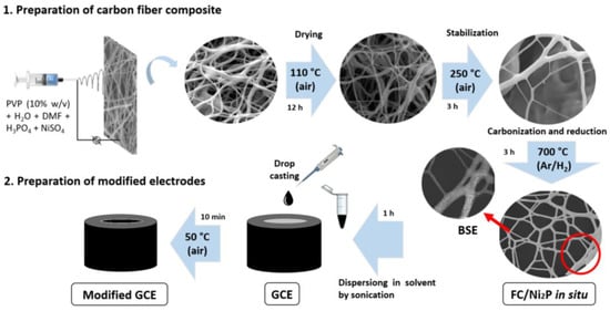 For the modification of glassy carbon electrodes, the drop casting technique was used. Dispersions of 2.0 mg/mL of the synthesized materials dissolved in 0.2% Nafion in isopropanol and water were prepared. For the case of the ex situ Ni2P/FC composite, the ratios were massed with 60 wt% FC, which corresponds to a concentration of 2.0 mg/mL. All dispersions were sonicated for 1 h. Before each modification, the glassy carbon electrode must be polished. The electrode was polished in 0.3 and 0.05 µm alumina and then washed with Milli-Q water. Ten microliters of the dispersion were taken and deposited on the surface of a glassy carbon electrode and then dried at 50 °C for 10 min. Scheme 1 illustrates the preparation, both of carbonized nanofiber composites and modified electrodes, successively.