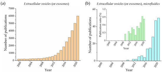 Number of publications per year that contain the keywords: extracellular vesicles (or exosomes) (a) and extracellular vesicles (or exosomes) and microfluidics (b). An inset with the ratio between these two numbers is also reported. (Source: Web of Science database, excluding review, meeting abstract, and retracted papers).