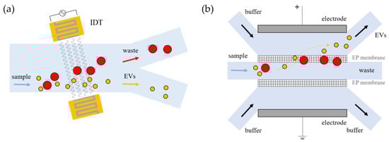 Examples of physical forces to separate vesicles within microfluidic chips. (a) Device with interdigitated electrodes generating acoustic waves to separate EVs from the initial sample; (b) differentiation of EVs through membranes mediated by electrophoretic (EP) forces.