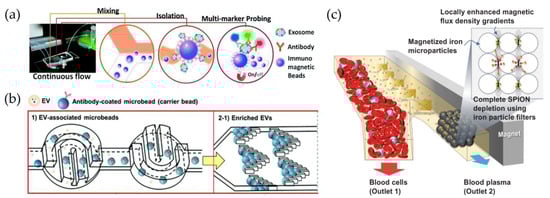 Functionalized beads or nanoparticles used for vesicle capture inside microfluidic devices. (a) Immunomagnetic beads coated for the enrichment of vesicles from blood plasma inside ExoSearch chips [126]; (b) streptavidin-coated polystyrene beads used as substrate to trap vesicles in herringbone filters and redisperse them [137]; (c) microfluidic systems used to flow blood samples and isolate vesicles by means of superparamagnetic nanoparticles (SPIONs), modified from [138].