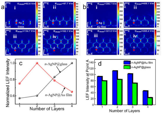 Figure 1a(i–iv) show the simulation results of LEF distribution of the n-AgNP@glass (n = 1, 2, 3, 4). Clearly, the number of LEF hotspots increased with the increase in AgNPs layers. Due to the surface plasmon hybridization between layers, the LEF intensity improved with the increase in AgNPs layers (Figure 1c), which is in agreement with the results reported in the literature [17,18]. For 1-AgNP@glass and 2-AgNP@glass, the maximum LEF hotspots were located at the gaps between adjacent AgNPs at the bottom layer. For 3-AgNP@glass and 4-AgNP@glass, the position of the maximum LEF hotspots has moved up, and were located at the gaps between adjacent AgNPs of Layer 1 and Layer 2 (here, the AgNPs layer’s serial numerals (1–4) increases from bottom to top for each model). As shown in Figure S3, when there were five layers of AgNPs on the glass support (5-AgNP@glass), the strongest LEF hotspots further shifted upward to the gaps between adjacent AgNPs of Layer 2 and Layer 3. It can be seen that the position of the strongest LEF hotspots of the n-AgNP@glass has a trend of gradually shifting upward as the layers of AgNPs increased. However, as can be seen from Figure 1d, the LEF intensity at point A (in the gaps between adjacent AgNPs at the bottom layer, which is marked in Figure S1) has a decreasing trend when the number of layers exceeds two, mainly because the scattering effect of nanoparticles led to the incident light flux gradually decreasing from the top to the bottom, and the plasma coupling effect of the bottom AgNPs weakening [15].