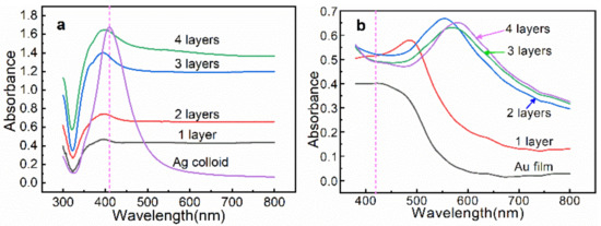 (a) UV–vis extinction spectra of the Ag colloids and the n-AgNP@glass substrates. (b) UV–vis extinction spectra of the Au film and the n-AgNP@Au film substrates.