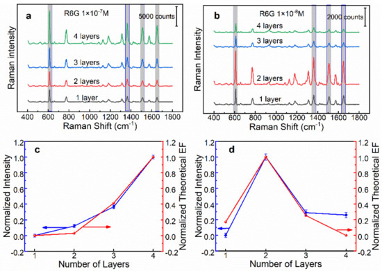 (a) The SERS spectra of 1 × 10−7 M R6G collected on the n-AgNP@glass substrate (n = 1, 2, 3, 4). (b) The SERS spectra of 1 × 10−8 M R6G collected on the n-AgNP@Au film substrate (n = 1, 2, 3, 4). (c,d) The variation of normalized SERS intensity at 612 cm−1 and normalized theoretical enhancement factor with the layer number of AgNPs on glass and Au film supports, respectively.