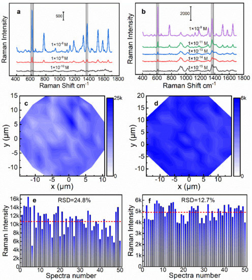 The reproducibility is another important indicator to evaluate the performance of the SERS substrate. Therefore, we prepared five different batches of 4-AgNP@glass substrates and 2-AgNP@Au film substrates, respectively, by using the same approaches described above. Then, the SERS spectra of R6G on 10 random points were collected for each substrate under the same test conditions. As illustrated in Figure 5e,f, we plotted the histogram of Raman intensities at 612 cm−1 of 4-AgNP@glass substrates and 2-AgNP@Au film substrates, respectively. As a result, the calculated RSD of the Raman intensity at 612 cm−1 was 24.8% for the 4-AgNP@glass substrates, while it was 12.7% for the 2-AgNP@Au film substrates. The above results indicated that the 2-AgNP@Au film substrate had a better reproducibility, which was consistent with our previous prediction, i.e., the fewer layers of AgNPs, the more controllable the quality of the SERS substrate.