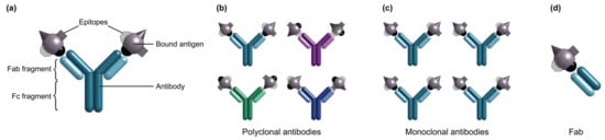 (a) Illustration of an antibody and bound antigens. Illustrations of different antibody subtypes, including (b) polyclonal antibodies, (c) monoclonal antibodies, and (d) a Fab fragment. Note that polyclonal antibodies are produced as heterogeneous mixtures in which different antibodies may bind to different epitopes of the same antigen. Monoclonal antibodies are produced as homogeneous samples in which all antibodies bind to the same epitope.