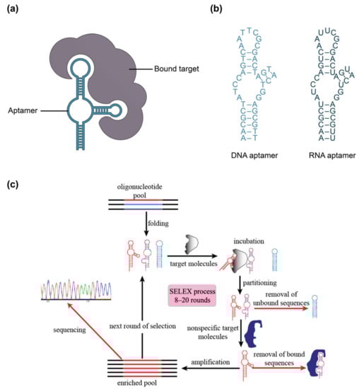 (a) Illustration of aptamer and bound target. (b) Visual representation of aptamer subtypes: DNA and RNA aptamers. (c) Illustration of SELEX (systematic evolution of ligands by exponential enrichment) process to design aptamers against a target. In (c), different colors in the oligonucleotide pool represent different nucleic acid sequences, while different colors in the sequencing step represent different nucleic acid bases identified by Sanger sequencing or high-throughput sequencing methods. Part (c) is reprinted from Ref. [] in accordance with the Creative Commons Attribution 4.0 International (CC BY 4.0) license.