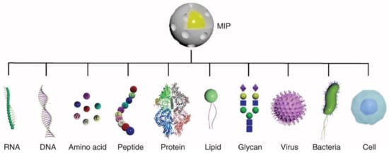 MIPs can be templated with an array of targets including: RNA, DNA, amino acids, peptides, proteins, lipids, glycans, viruses, and bacterial or cell epitopes. Reproduced from Ref. [] in accordance with the Creative Commons Attribution 4.0 International license (CC BY 4.0).