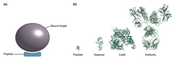 (a) Illustration of peptide bound target. (b) Comparison of peptide, aptamer, Cas9 enzyme and antibody relative sizes, informed by protein data bank crystal structures 2AU4, 4OO8 and 1IGY [,,]. Peptides are smaller than aptamers, antibodies, and many other bioreceptor classes discussed here, offering potential improvement in SiP biosensor sensitivity by bringing the binding interaction into a region of the evanescent field with higher field intensity.