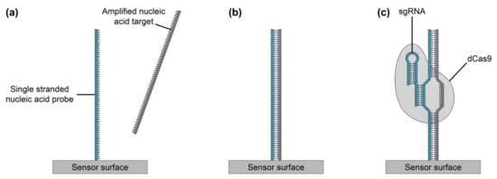 Short, single-stranded nucleic acid probes have been widely used for the detection of nucleic acid targets via hybridization-based SiP sensing (Figure 4) [,,]. Both ssDNA and RNA sequences can be immobilized on a biosensor surface, where they bind complementary nucleic acid target sequences through hydrogen bond formation, yielding DNA-DNA, DNA-RNA, or RNA-RNA duplexes [,,]. Such biosensors are often called genosensors []. Compared to aptamers, which can be designed to bind many different types of target molecules, nucleic acid probes can only bind other nucleic acids []. Additionally, the function of nucleic acid probes depends primarily on their nucleotide sequence, not on their three dimensional structure: once the target gene sequence is known, the complementary probe can be designed directly []. This means that nucleic acid probes can be designed against a new target very quickly compared to antibodies and aptamers. Short nucleic acid probes of 100 nucleotides or less can be synthesized using well-characterized phosphoramidite chemistry [,,,]. This synthetic method of nucleic acid synthesis is highly reproducible, allows for the incorporation of functional groups like thiols and amines to aid in probe immobilization on solid substrates, and is typically low-cost [,,,]. Another key advantage of nucleic acid probe-based biosensors is that they can be thermally or chemically regenerated with good reproducibility between sensing cycles [].