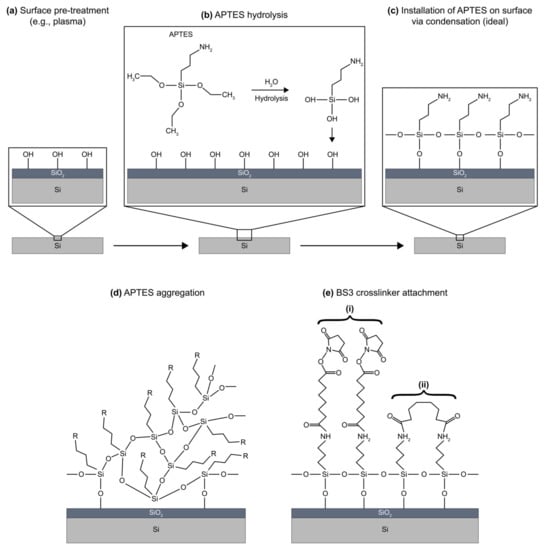 - Smith, E.A.; Chen, W. How to prevent the loss of surface functionality derived from aminosilanes. Langmuir 2008, 24, 12405–12409. [Google Scholar] [CrossRef] [PubMed]