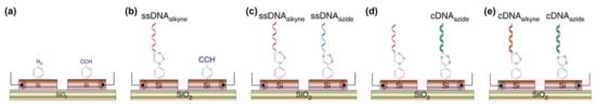 - Cattani-Scholz, A.; Pedone, D.; Dubey, M.; Neppl, S.; Nickel, B.; Feulner, P.; Schwartz, J.; Abstreiter, G.; Tornow, M. Organophosphonate-based PNA-functionalization of silicon nanowires for label-free DNA detection. ACS Nano 2008, 2, 1653–1660. [Google Scholar] [CrossRef] [PubMed]