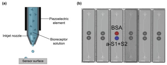 Many different biofunctionalization strategies are available and should be carefully chosen and optimized to suit the application and sensor architecture. In general, the selected bioreceptor should have good selectivity toward the target analyte to ensure low cross-reactivity with non-target molecules in the sample, high affinity toward the target to achieve fast, sensitive detection, good stability to retain consistent binding activity over time, and reproducible production to ensure predictable and replicable sensor performance across batches/lots of reagents []. The strategy used to immobilize bioreceptors on the sensor must not damage the sensor surface or the bioreceptors, and it should be compatible with any system-level integration required for the sensor chips (e.g., chip-mounted lasers and detectors, photonic wire bonds, etc.). It should also allow for oriented bioreceptor immobilization to optimize target accessibility and binding activity, permit uniform bioreceptor coverage on the sensor surface to ensure predictable and consistent target binding across all active sensing areas, have good stability to prevent bioreceptor detachment, and be reproducible [,]. The patterning strategy refers to the method by which bioreceptors are deposited on specific locations of the sensor surface (Figure 1c). This is required for multiplexed sensing and to confine bioreceptors to active sensing areas, thus preventing target depletion from dilute samples during sensing [,,]. The selected patterning technique should not damage the sensor surface or bioreceptors. It should also have sufficient resolution for the selected application, be multiplexable so multiple different bioreceptors can be handled and deposited on a single substrate, produce uniform patterns with good spot-to-spot reproducibility, be compatible with the immobilization protocol (e.g., patterning under conditions that preserve functional groups on the silicon surface), and have low reagent consumption to conserve costly and precious reagents.