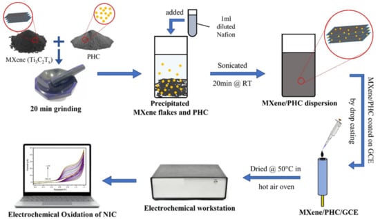 To begin, the glassy carbon electrode (GCE of 3 mm diameter) was delicately cleaned using the standard washing process to achieve a reflective surface [43]. Next, 8 µL of the MXene/PHC dispersion was drop-casted over the GCE surface and dried in a hot air oven at 50 °C (Figure 1). After that, MXene/PHC/GCE was slightly immersed in DI water to remove any loosely bounded particles from the modified electrode surface. In addition, the MXene/GCE (without PHC) was prepared in the same way for the examination of the samples to confirm that MXene/PHC is superior to MXene for NIC sensing.