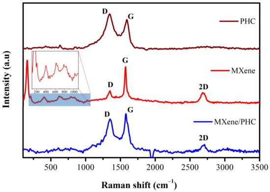 Raman spectra of PHC, MXene and MXene/PHC composite. Inset: an enlarged spectrum of MXene.
