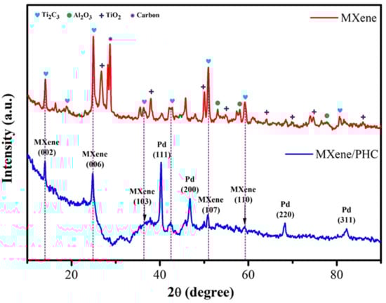 The crystalline properties of MXene and MXene/PHC composite were determined by XRD analysis (Figure 3). The diffraction peaks (2θ value) of MXene observed at 14.57° (002), 18.96° (004), 24.8° (006), 36.41° (103), 50.79° (107) and 59.22° (110) [49,50], which are matched with JCPDS No. 52-087 and confirmed the MXene formation. In addition, some XRD bands were observed at 2θ values of 26.7°, 37.94°, 49.9°, 54.7°, 64.1°, 69.7° and 74.7°, and 53.1°, 58.1° and 77.8°, which corresponded to the oxide peaks of TiO2 and Al2O3, respectively. Additionally, the graphitic carbon peak was found at 28.6° (red curve). From this XRD spectrum, the synthesis of mixed phase MXene was confirmed [43,51]. Moreover, the XRD pattern of MXene/PHC composite was encompassed with all of the distinct peaks of MXene (14.57°, 24.8°, 36.41°, 50.79° and 59.22°) and PHC (40.2°, 46.7°, 68.3° and 82.1°), as shown in Figure 3 (blue curve). The 2θ values of PHC were well matched with the previously reported research articles [52,53].