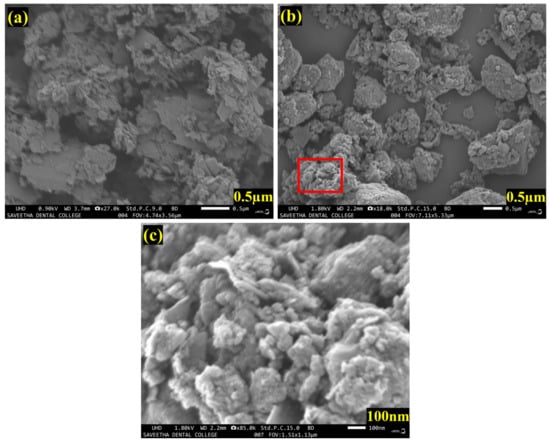 As shown in Figure 4a, FE-SEM images of as-synthesized mixed phase MXene (Ti3C2Tx) revealed a stacked layered structure. Our synthesis process clearly produced a few-layered MXene with a thickness of 100–400 nm. It can be seen that the FE-SEM image of the MXene/PHC composite showed the successful incorporation of PHC within the MXene layers (Figure 4b,c).
