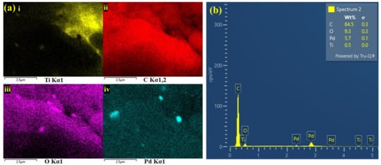 (a) Elemental mappings were performed on MXene/PHC composite: (i) titanium, (ii) carbon, (iii) oxygen and (iv) palladium. (b) EDS spectrum of MXene/PHC composite.