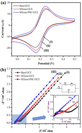 (a) CVs and (b) EIS spectra of (i) bare GCE, (ii) MXene/GCE and (iii) MXene/PHC/GCE in 0.1 M KCl with 2 mM [Fe(CN)6]3−. Inset: (1) Randle’s circuit and (2) enlarged area of highlighted part of the spectrum.