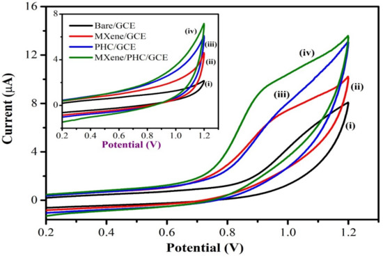 The cyclic voltammograms (CVs) were recorded using bare/GCE, MXene/GCE, PHC/GCE and MXene/PHC/GCE in 0.1 M phosphate buffer before and after the addition of 300 µM of NIC. Before addition of NIC, the MXene/PHC/GCE exhibited CV curve with a higher background current than MXene/GCE, PHC/GCE and bare GCE (Figure 7 (inset)). There were no oxidation or reduction peaks observed in the potential window of +0.2 V to +1.2 V. However, when NIC (300 µM) was added, the MXene/PHC/GCE exhibited a higher oxidation peak current (8.9 µA) at +0.9 V than MXene/GCE (5.5 µA), PHC/GCE (5.3 µA) and bare GCE (2.1 µA) (Figure 7). According to earlier reports, NIC begins to oxidize at a potential of ~0.9 V on the modified GCE [7,29,36,57].