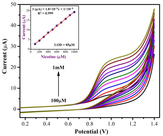 Nicotine (NIC) is one of the most addictive and hazardous drugs ever. As a main alkaloid, NIC [3-(1-methyl-2-pyrrolidinyl) pyridine] is found in tobacco leaves (Nicotiana tabacum L., Solanaceae) [1]. Initially, it was used for medical applications, but later, it became well known for its use in cigarettes. Overdose of NIC may lead to an increase of blood circulation to the heart, pulse rate, hypertension and artery contraction (blood carrying vessels). Nicotine may raise the risk of heart stroke as well as contribute to arterial wall hardening. This drug can stay in the body for up to 8 h based on how habitually it is used [2,3]. A fatal dose of NIC for kids is 10 mg (maximum), while for adults, it is 40 to 60 mg (0.5 to 1.0 mg kg−1 of body weight) [4]. Every day, more than a billion people use various forms of tobacco products, which causes them to become addicted to NIC. Nicotine is a tobacco-specific substance, which makes up of 95% of the entire alkaloid content in cigarettes and other tobacco products [5]. As a result, it is present in the human body fluids (0.5 mM to 0.8 mM of NIC in human saliva is considered a medically hazardous level) of both active and passive smokers (persons who had long term exposure to second-hand smoke) [6]. NIC is a substance that has an impact on the brain by evoking a sensation of euphoria, reviving energy and enhancing the mood, but it also poses some serious health risks, the most serious of which are heart, brain and respiratory conditions, causing lung carcinoma [7]. The World Health Organization (WHO) reported that tobacco usage is one of the leading causes of illness, as well as death, in India (causing around 1.35 million deaths each year). According to the CDCP (Centre for Disease Control and Prevention), smoking either passively or actively caused close to 0.16 million American deaths (affected by oral and lung cancer) in 2019 [8]. Apart from its negative impacts, research has been done to determine the therapeutic benefits of NIC for various diseases, such as ulcerative colitis, Alzheimer’s and Parkinson’s [7]. Thus, it is important to accurately determine NIC concentration in forensic samples, medications, human body fluids, toxicological samples, etc. Generally, NIC determination was performed by the use of high-performance liquid chromatography (HPLC) [9,10], chemiluminescence [11], capillary electrophoresis with mass spectrometry (CE/MS) [12], HPLC with mass spectrometry (HPLC/MS) [13], immunoassays [14], gas chromatography [15,16] and other chromatographic techniques [15,16,17,18]. These methods have some limitations, such as the requirement of a pretreatment process for each sample, the complex instrumentation system needed, the requirement of trained technicians and the high cost.