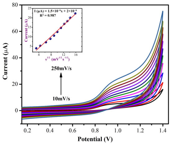 Using CVs, the concentrations of NIC were determined using MXene/PHC/GCE in 0.1 M phosphate buffer at a scan rate of 0.05 V s−1. The concentrations of NIC varied from 100 µM to 1 mM. As shown in Figure 9, the oxidation peak currents (Ipa) of NIC were increased linearly with the concentrations. This demonstrated the high sensitivity and stability of the MXene/PHC/GCE towards the NIC oxidation reaction. Next, to study the effect of scan rates on NIC oxidation, CVs were recorded with the varied scan rates from 10 mV s−1 to 250 mV s−1 in 0.1 M phosphate buffer with 500 µM NIC using MXene/PHC/GCE. The oxidation peak currents (Ipa) of NIC were gradually increased with respect to the square root of the scan rate, as shown in Figure 10. According to the kinetic controlled process, the oxidation peak potential (Epa) of NIC slowly moved to the positive side. The linear equation was found to be Y = 1.5 × 10−6x + 2 × 10−6 with a correlation coefficient (R2) of 0.987 (Figure 10, Inset). This data confirmed that a diffusion-controlled oxidation process of NIC occurred on the MXene/PHC/GCE [59,60]. In order to find out the suitable pH for NIC analysis, CVs were recorded at different pH buffers containing 1 mM nicotine (from pH 2 to 11) using a MXene/PHC/GCE sample.