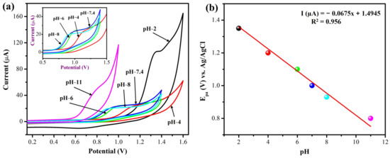 The Ipa and Epa of nicotine were examined in different pH buffer solutions (pH 2–11), as shown in Figure 11a, b. It was observed that the oxidation peak potential of NIC started to move towards the negative potential when the pH of the buffer increased; it demonstrated that the electro-oxidation of NIC involves the same number of protons. Simultaneously, the Ipa of NIC was higher in pH 2 and 11, while in the other pH 4 range, almost the same current responses were observed. If we look more closely, the Ipa of NIC was higher in pH 7.4 than in pH 6. By considering the pH of human body fluids (pH 5.5 to pH 8), we adopted pH 7.4 to determine the NIC in human sweat. Additionally, Figure 11b displayed the relationship between the pH and Epa of NIC, which gave a slope of −67.5 mV/pH, a value that was similar to the theoretical value (−59 mV/pH) of the Nernst equation. This demonstrated that the nicotine oxidation process on the MXene/PHC/GCE was involved with the same number of electrons and protons [61].
