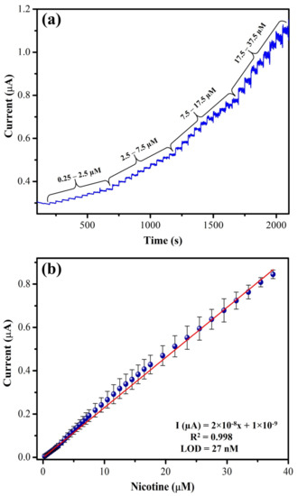 The amperometry technique was carried out to investigate the linear range NIC determination at +1.0 V using a MXene/PHC/GCE in 0.1 M phosphate buffer. When NIC concentrations were increased from 0.25 µM to 37.5 µM [28,57,62], MXene/PHC/GCE produced a linear current response for each addition of nicotine by amperometry (Figure 12), and the sensitivity was calculated as 0.286 µA µM−1 cm2. In the dynamic linear range of determination, amperometry is more accurate than CV. The obtained high sensitivity of the sensor could be attributed to the quick response by electrocatalytic oxidation of NIC by MXene/PHC/GCE [63]. The LOD of nicotine was measured as 27 nM. It should be mentioned that at the higher concentration of NIC, the steady state current began to drop because the catalyst’s active regions of the modified electrode might have been saturated. The analytical performance of the proposed method is also compared with other NIC sensors. Table 1 shows the comparison of the linear range of detection, LOD and oxidation potential of NIC. It can be mentioned that our sensor’s performance is relatively comparable to other reported methods.