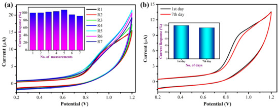 (a) Repeatability measurements of 300 µM NIC using a same MXene/PHC/GCE up to seven repeated measurements in 0.1 M phosphate buffer (Inset shows the bar graphs of No. of measurements vs. NIC oxidation peak current response of each measurement). (b) The stability of the MXene/PHC/GCE towards the oxidation of 300 µM NIC in 0.1 M phosphate buffer (Inset: bar diagram shows current responses of NIC vs. no. of days).