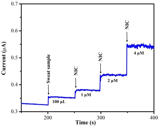 NIC determination in real-world sample (sweat) by amperometry at 1 V in 0.1 M phosphate buffer (pH 7.4) with a rotation rate of 750 rpm.