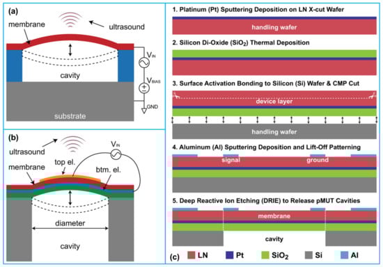 (a) Anatomy and working principle of a typical CMUT; (b) anatomy and working principle of a typical PMUT; (c) a typical fabrication process of a lithium niobate (LN) based PMUT. Reprinted from Ref. [26] with permission.
