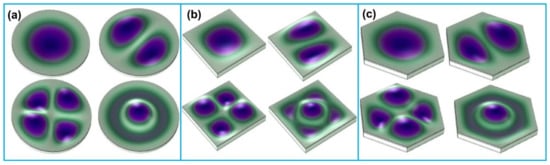 Vibration modes of different diaphragm structures: (a) circular diaphragm; (b) square diaphragm; (c) hexagonal diaphragm. (a–c) Reprinted from Ref. [37] with permission.