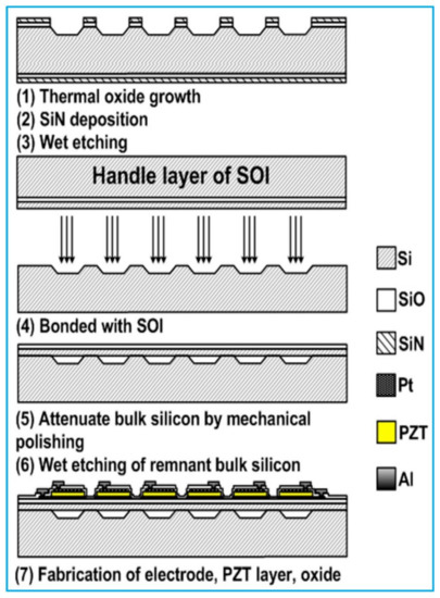 A typical fabrication process flow is demonstrated in Figure 6 [125]. The process begins with a custom-fabricated cavity SOI wafer. The first mask is applied to pattern cavities in the handle wafer first; the cavities specify the location of each PMUT element. After that process, the handle wafer and device wafer are bonded in vacuum, followed by grinding and polishing to produce the desired thickness of the Si device layer. Alignment marks are then etched into the handle wafer at the same time that the cavities are exposed by selectively etching openings in the Si device layer. Following that, the bottom electrode and PZT layer are deposited via sputtering.