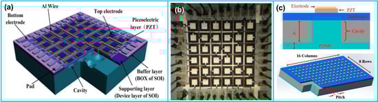 (a,b) A photograph image of the 6 × 6 PMUT array with element size 200 µm × 200 µm; (c) schematic of the PMUT with PDMS backing structure. (a,b) Reprinted from Ref. [125] with permission; (c) reprinted from Ref. [128] with permission.