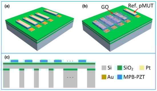 Sun et al. [149] proposed a humidity sensor based on a PMUT array functionalized with graphene oxide thin film which was deposited on the array using facile drop-casting method (Figure 9). The PMUT linear array consisted of 15 rectangular elements. Their experiments found that the graphene oxide functionalized PMUT array exhibited great potential for humidity detection. Roy et al. [150] fabricated a dual electrode PMUT integrated with a microfluidic system as a fluid density sensor in hemoglobin content measurement applications. The PMUT microfluidic integration was able to detect low volumes of fluid densities in a range of 774–1496 kg/m3. The sensitivity of the device was 26.3 Hz/(kg/m3), which was capable of detecting the hemoglobin content of human blood even with only 1% change. Xu et al. [151] developed a PMUT array that consisted of a pair of concentrically aligned circular and annular arrays for transmitting and receiving ultrasonic signals for contact force sensing application. The developed PMUT array illustrated an emitting sensitivity of 1200 Pa/V and the contact force measuring sensitivity of −111 N/dB.