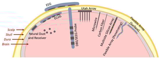 Three types of neural electrodes are used to capture the electrophysiological activities of neurons: non-invasive, semi-invasive and invasive. The non-invasive electrode is usually a head-worn type, does not require surgery but has a poor spatial resolution, and can only detect electroencephalography (EEG) signals. The semi-invasive electrode is implanted between the skull and the cerebral cortex. It causes less tissue damage than the invasive electrode, thereby measuring the electrocorticography (ECoG) signal. The major types of neural electrode interfaces in brain are shown in Figure 1. The implanted nerve electrode should pass through the cerebral cortex and enter the brain tissue. Therefore, there is a significant requirement for the safety of the electrode and the surgical process. It requires implantable electrodes of high spatial and temporal resolution for a single neuron to record and modulate neural activity in a sub-millisecond [33]. The implantable electrodes were gradually developed from single-channel to multi-channel recording from the metal microwire electrode [34] at the beginning to the Utah and Michigan electrodes [10,35,36] based on silicon. It had excellent performance detecting electrophysiological signals or controlling neural activities, including the deep brain stimulation (DBS) electrode mentioned above for clinical treatment of psychomotor disorders. Moreover, it can capture local field potentials (LFPs) through external cables connected to constantly developing DBS conductors [37]. The development trend of various types of electrodes on the time axis is in Figure 2.