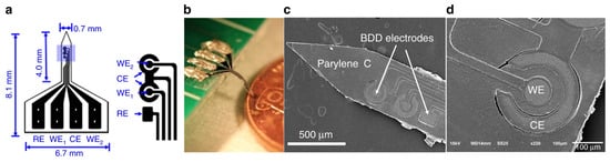 (a) Diagram of the BDD microelectrode probe. (b,c) Picture and SEM images of the manufactured neural probe. (d) A close-up view of the BDD WE and CE have been provided by the SEM image.
