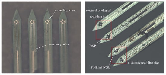 Another common way to form a needle tip array through MEMS technology is on the silicon substrate. The tip is coated with platinum-black, iridium oxide, or other materials to conduct electricity. The electrode column is insulated using a Parylene C layer with good biocompatibility or directly developing the Parylene into a flexible microelectrode array [100,101]. Silicon microarray electrodes can fulfill the needs of most electrophysiological records and have been successfully deployed in many neuroscience applications [102,103]. In addition, silicon can be used as the sensor matrix material for neurochemical signals in the brain. Thus, silicon microprobe is used to realize dual-mode detection of electrophysiology and electrochemistry. Electrical and neurochemical activities can be correlated by using the same equipment [104]. M.D. Johnson et al. [105] developed a neural probe based on a Michigan silicon-substrate probe. It was formed on silicon using a planar process for simultaneously detecting neurochemical and electrophysiological signals in rats. The array had a single handle with seven platinum and seven iridium microelectrode sites. The platinum sites on each array were plated with platinum-black and electropolymerized with Nafion. It increases dopamine sensitivity by 74%, reduces the sensitivity of common interfering substances by at least 89%, and monitors neural activity within adjacent iridium sites.