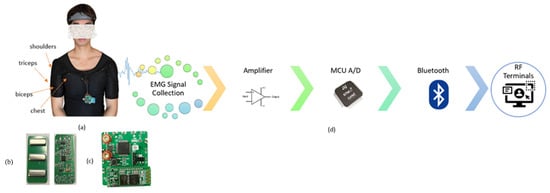 (a) Positions of EMG sensing electrode in wearable EMG fitness shirt; (b) EMG sensing electrode; (c) PCB; (d) Signal transmission pipeline.