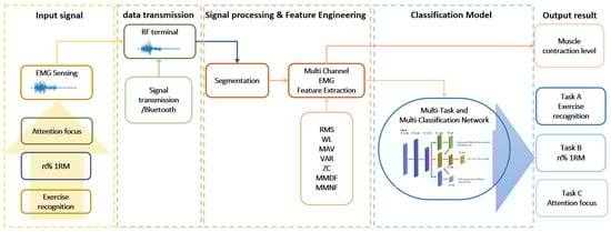 The system framework is illustrated in Figure 2. It starts by detecting attentional focus via a fitness shirt fitted with noninvasive dry electrodes that are firmly attached to the body and then simultaneously measures muscle activity during training. During standard lifting exercises, multitask and multiclassification networks are used to track the user’s attention during isolated and compound muscles in the upper limbs. Note that data processing was conducted offline following the collection of the experimental data.