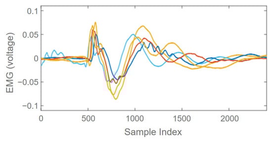 Signal collection was based on the use of electrodes on the training muscle as the source and reference electrodes. We investigated the signal when the user wore the shirt because the device’s position and orientation might not be identical if the gesture signal is sensitive to this position/orientation; therefore, the EMG might not be viable for practical applications. In this pre-experiment, five people were asked to wear the device and perform a bench press, producing natural diversity across the subjects. Figure 3 shows the consistency of the detected signal when the same exercise gesture was performed by the subjects. The raw measurements were reasonably consistent with the specific exercises. The recognition performance is discussed in Section 3.2.