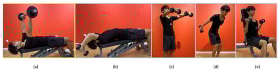 We recruited 12 healthy male college students who participated in personal weight training activities (12 subjects, age (M = 23.92 years, SD = 1.93 years), height (M = 175.17 cm, SD = 4.72 cm), weight (M = 72.89 kg, SD = 5.75 kg), and BMI (body mass index) (M = 23.81, SD = 2.33). To enable us to determine the force, participants underwent a strength assessment. We targeted five exercises recommended by the resistance training guide for healthy adults []. The four isolated exercises were lying pullovers, front raises, kickbacks, and biceps curls, and the one compounded exercise was a bench press, as shown in Figure 4. These are among the most common exercises that target different muscle groups in the body with respect to the target muscles. Experiments align with constrained action as a research experiment with attentional focus for resistant training and weightlifting []. The subjects performed five exercises with dumbbells weighted with a mass equivalent to the estimated 67% and 85% of 1RM []. Each participant performed 12 repetitions of each exercise in each session, with weights considered appropriate for their strength training. In total, each participant performed 72 repetitions of each exercise, resulting in 360 repetitions in the attention condition and without attentional focus. Reminders on the attentional focus (with and without) were given before each session. They were given rest periods of approximately 5 min between each session and condition. Data were collected at a fitness center on a university campus. Throughout data collection, subjects were instructed to perform five exercises following the exercise’s explicit instructions and performed without carrying weight for the baseline data. To capture intra-subject variability, each participant attended six sessions of data collection on three days.