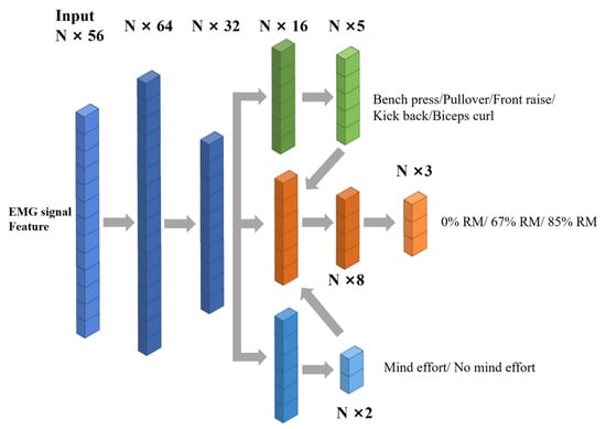 In this work, we propose a multitask and multiclassification network that considers different exercises (task A), attentional focus (task B), and 1RM (task C) as three subtasks and classifies them uniformly to better guide people during exercise. The proposed network architecture is shown in Figure 5. The input of the network consists of 56 features extracted from the EMG signal (eight channels, seven features for each channel). The three subtasks share the same input, and the features of the three subtasks are extracted from the input data through two fully connected layers (followed by a dropout layer). The unique features were extracted and classified through the full connection layers of the branches of the three subtasks. Subtask A classified different exercises, subtask B determined whether the exercise had a focus of attention, and subtask C determines different 1RMs. Multitask and multiclassification processes consist of three subtasks that share the same inputs. Twelve repetitions of each session for each person were divided into a training set, verification set, and test set for eight repetitions, two repetitions, and two repetitions, respectively, in which the shared features were extracted and the unique features were extracted for completion of the subtasks. All of the above full connection layers go through a sigmoid activation function. Task B, the classification of RM, did not parallel the other two tasks. Its classification depends on specific exercises and attentional focus because, for different exercises, different RMs may generate EMG signals with similar energy. For example, 67% RM for exercise 1 and 85% RM for exercise 2 may generate EMG signals with similar energy. Therefore, we designed a fusion layer before the classification layer of task B which combines the output vectors of tasks A and C with the feature vectors of task B before classification. Through the fusion layer, the exercise information and focus information are introduced into task B so that it can narrow the range of the feature space and obtain the correct RM.