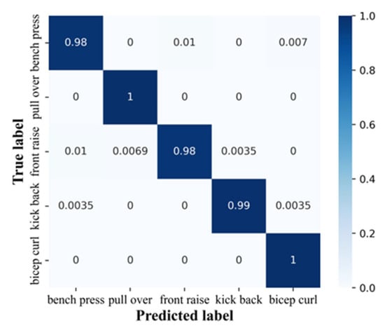 We further investigated the results of exercise recognition in detail. If the position and orientation of the device are not identical and the posture signal is sensitive to this difference, the EMG may not be suitable for practical applications. The raw data are still reasonably consistent with the exercise in question. As shown in Figure 6 and Table 1, two out of the five exercises achieved 100% accuracy and specificity. The EMG fitness shirt can achieve a high recognition performance accuracy of 99% across all five exercises involving the targeted muscles in a subject-exercise manner. Taken together, our results confirm that the system can achieve high recognition performance across all five exercises in a subject-exercise manner with respect to the targeted muscles. This experiment proves the consistency of the signal generated from the natural variation among subjects, demonstrating that the detected signals are consistent when subjects perform the same exercise posture.
