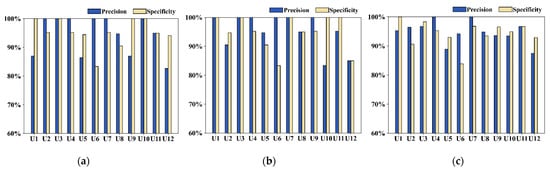 We first show the performance of the system through the recognition of attentional focus at different 1RMs. Figure 7 shows the results of the overall recognition performance for attentional focus at 67% and 85% of the 1RM and without lifting any weights. The most frequent classification output was selected as the result for each subject. Figure 7a shows the recognition performance of the user’s attentional focus without lifting any weight. Eight subjects had attentional focus recognition with greater than 90% precision, while the remaining four had more than 80% precision. As can be seen for the 67% 1RM in Figure 7b, the system achieved am attentional focus recognition precision greater than 90% for 10 subjects, while the remaining two achieved more than 80%. As shown in Figure 7c, the system also achieved an attentional focus recognition precision of 90% for 10 subjects at 85% of the 1RM, while the remaining two achieved more than 85%. To summarize the overall performance of the system in the recognition of attentional focus at 67% and 85% of the 1RM, good precision (M = 94.79%, SD = 3.77%) and specificity (M = 94.35%, SD = 4.20%) were achieved.
